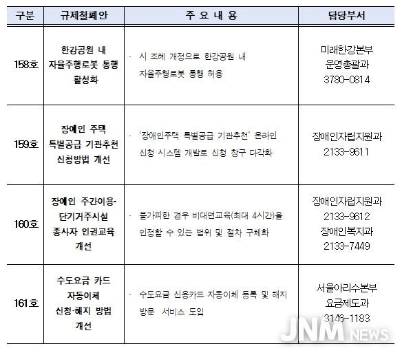 서울시는 내년 상반기 중으로 ▴한강공원 자율주행로봇 통행 허용(158호) ▴장애인주택 특별공급 기관추천 신청방법 개선(159호) ▴장애인시설 종사자 인권교육 개선(160호) ▴수도요금 카드 자동이체 개선(161호), 총 4건의 규제를 개선하겠다고 밝혔다.