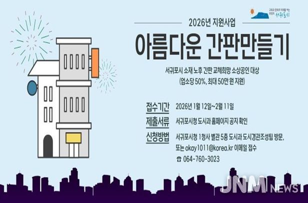 제이앤엠뉴스 | 서귀포시는 관내 소상공인을 대상으로 간판 교체를 위한 ‘2026년 아름다운 간판 만들기 지원사업’을 추진한다고 밝혔다.