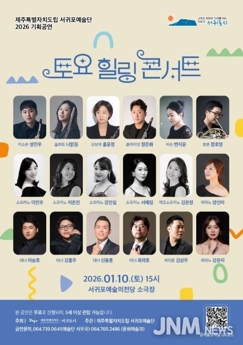 제이앤엠뉴스 | 서귀포시는 10일 15시 서귀포예술의전당 소극장에서 도립서귀포예술단의 기획 공연 ‘2026 즐거운 주말 ! 토요 힐링 콘서트’를 개최한다.