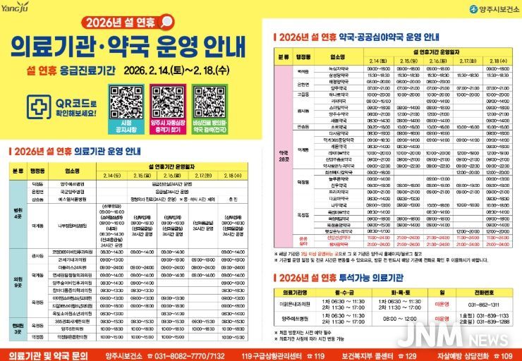 설날 연휴 기간 운영 의료기관 및 약국 정보는 ▲양주시 보건소 ▲119구급상황관리센터(☎ 119) ▲보건복지부 콜센터(☎ 129)를 통해 문의할 수 있다.