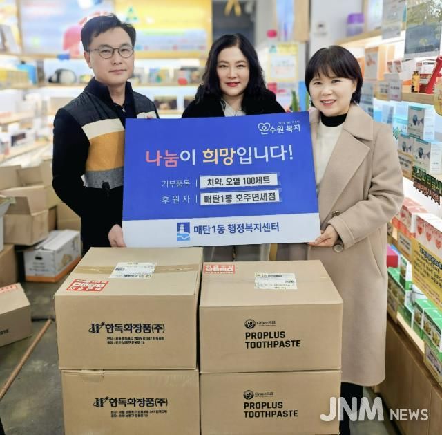 제이앤엠뉴스 | 영통구 매탄1동 행정복지센터는 지난 3일 호주면세점직영할인점 매탄점이 설 명절을 맞이해 매탄1동 행정복지센터에 프로폴리스 치약 100개, 오일 관절크림 100개를 후원했다고 밝혔다.