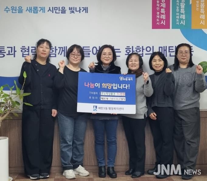 제이앤엠뉴스 | 수원시 영통구 매탄3동은 지난 3일 매탄3동 7, 8, 9, 13, 37통장 일동이 설 명절을 맞아 관내 어려운 이웃들에게 온누리상품권 50만원을 기부했다고 밝혔다.
