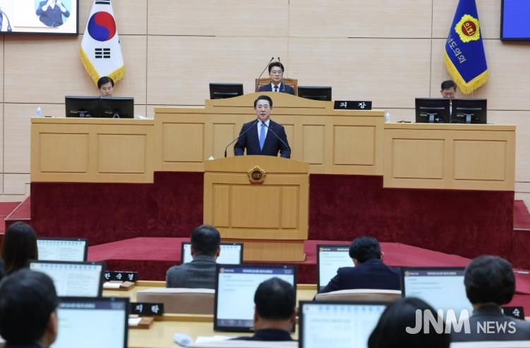 김영록 지사는 이날 제안설명을 통해 “전남·광주 행정통합은 AI·에너지 대전환 시대에 정부의 파격적 지원을 이끌어내 지역의 대부흥 시대를 열기 위한 절박함과 책임감의 산물”이라며 “산업을 일으켜 기업과 일자리가 늘어나고 청년이 돌아오는 균형발전과 번영의 선순환 구조를 만드는 것이 통합의 명확한 목적”이라고 설명했다.