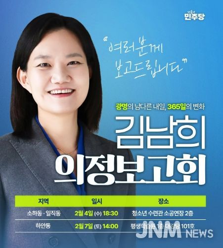 제이앤엠뉴스 | 더불어민주당 김남희 국회의원(경기 광명시을)은 오는 2월 4일과 7일, 두 차례에 걸쳐 ‘2025 김남희 국회의원 의정보고회’를 개최한다.