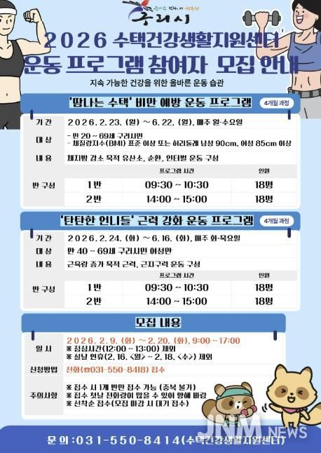제이앤엠뉴스 | 구리시 수택건강생활지원센터는 오는 2월 9일부터 성인과 중장년층의 비만 예방과 근력 강화를 위한 맞춤형 운동프로그램인 ‘땀나는 수택’과 ‘탄탄한 언니들’의 참여자를 모집한다고 밝혔다.