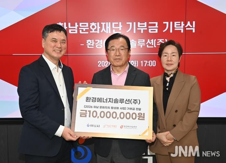 제이앤엠뉴스 | (재)하남문화재단은 2월 4일, 하남시청에서 환경에너지솔루션㈜으로부터 문화자치 활성화를 위한 기부금 1천만 원을 전달받았다고 밝혔다. 이날 기부식에는 이현재 하남시장을 비롯해 기업 및 재단 관계자들이 참석해 지역 상생과 ESG 실천의 의미를 공유했다.