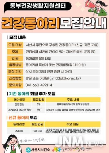 한편, 건강 동아리 모집에 대한 사항은 서산시 동부건강생활지원센터에 문의하면 된다.
