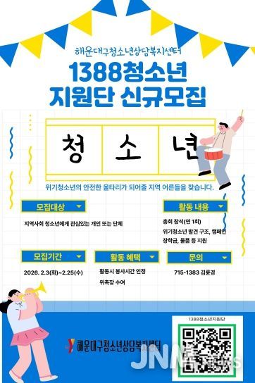 제이앤엠뉴스 | 해운대구 청소년상담복지센터는 지역 내 위기청소년들을 조기에 발견하고 든든한 울타리가 되어줄 ‘1388청소년지원단’을 이달 25일까지 공개 모집한다고 밝혔다.