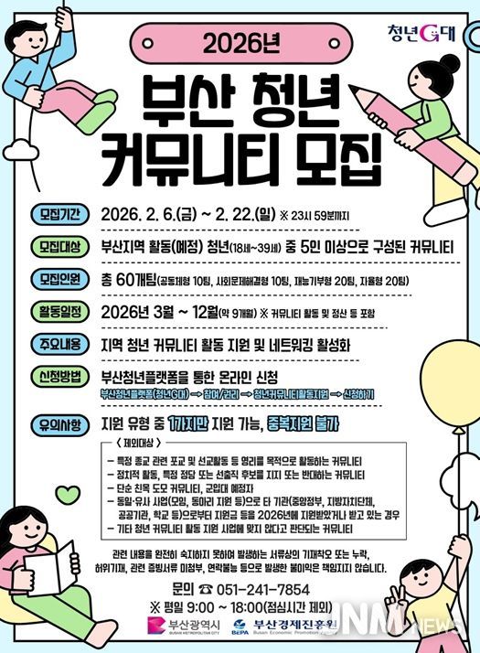제이앤엠뉴스 | 부산시는 오늘(6일)부터 2월 22일까지 '2026년 청년 커뮤니티 활동 지원 사업' 참여팀을 모집한다고 밝혔다.