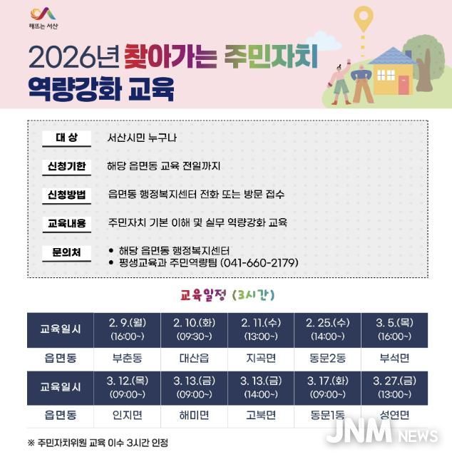 제이앤엠뉴스 | 충남 서산시는 2월 9일부터 3월 27일까지 관내 10개 읍면동을 대상으로 ‘2026년 찾아가는 주민자치 역량 강화교육’을 운영한다고 밝혔다.