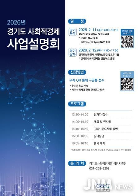 제이앤엠뉴스 | 경기도사회적경제원은 오는 11일과 12일 양일간 경기 북부와 남부에서 ‘2026년 경기도 사회적경제 사업설명회’를 연다.