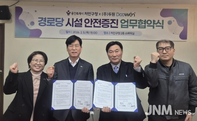 제이앤엠뉴스 | 용인특례시 처인구는 5일 처인구청 2층 소회의실에서 지역내 전기부품 생산 전문기업 ㈜두원과 ‘경로당 시설 안전증진 업무협약’을 체결했다.