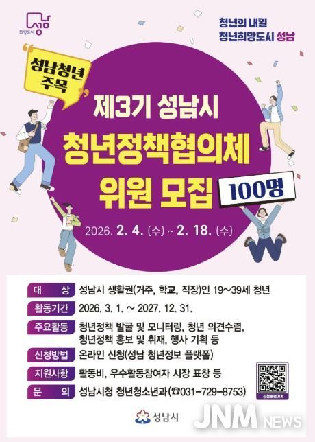 제이앤엠뉴스 | 성남시는 오는 2월 18일까지 ‘제3기 청년정책협의체’ 위원 100명을 공개 모집한다.