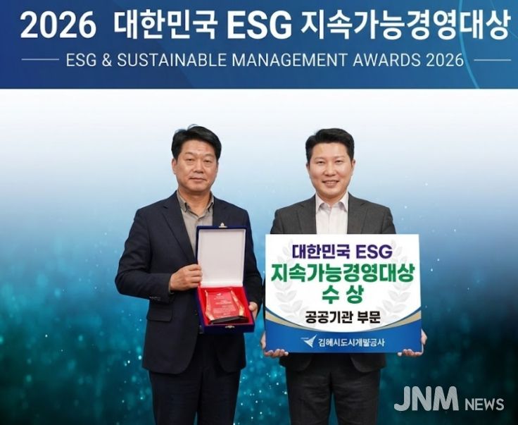 제이앤엠뉴스 | 김해시도시개발공사가 지난 4일 일산 킨텍스에서 열린 ‘2026 대한민국 ESG 지속가능경영대상’ 시상식에서 공공기관 부문 ‘대상’을 수상했다.