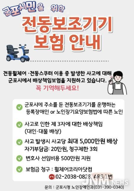 제이앤엠뉴스 | 군포시는 전동휠체어와 전동스쿠터 등 전동보조기기를 사용하는 장애인 및 노인장기요양보험법에 따른 노인을 대상으로 배상책임보험을 지원한다.