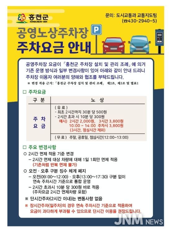 제이앤엠뉴스 | 홍천군은 공영 노상주차장 주차 관제시스템을 새롭게 도입하고, 2026년 2월부터 공영 노상주차장의 주차 요금 ‘부과 시간 산정 방식’을 변경해 시행한다고 밝혔다.