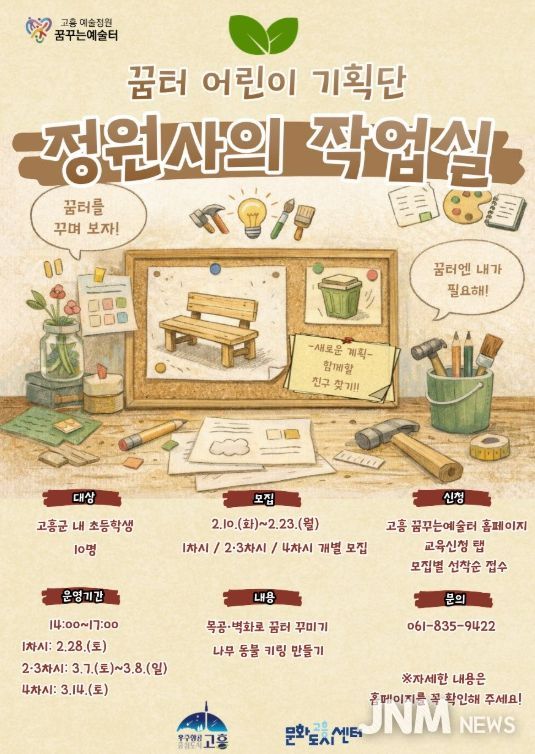 제이앤엠뉴스 | 고흥군은 오는 2월 10일부터 23일까지 꿈터 어린이 기획단 '정원사의 작업실'에 참여할 지역 내 초등학생 10명을 선착순으로 모집한다고 밝혔다.