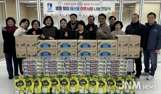 제이앤엠뉴스 | 지난 6일, 수원시 팔달구 매산동 단체장협의회는 설 명절을 앞두고 매산동 행정복지센터를 방문해 취약계층 지원을 위한 기부금과 먹거리 물품을 전달하며 이웃돕기 활동을 펼쳤다.