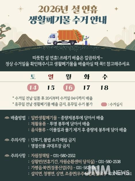 제이앤엠뉴스 | 가평군은 설 명절을 맞아 군민과 방문객 모두가 쾌적한 환경에서 청결한 연휴를 보낼 수 있도록 생활폐기물 처리 대책을 마련했다.
