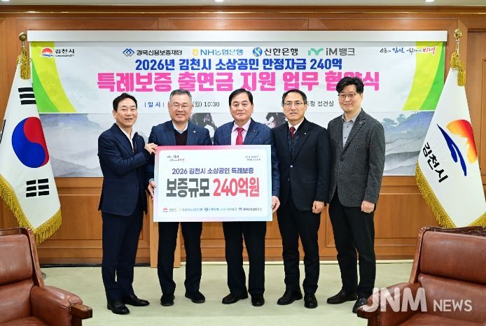 제이앤엠뉴스 | 김천시는 관내 소상공인 경영 안정자금 지원을 위해 경북신용보증재단, NH농협은행, 신한은행, iM뱅크와 협약을 맺고 총 240억 원 규모의 소상공인 특례 보증 지원에 나선다고 9일 밝혔다.