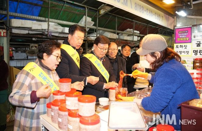 제이앤엠뉴스 | 전북특별자치도의회는 설 명절을 앞둔 10일 군산 주공시장을 방문해 전통시장 상인들을 응원하며, 시장 활성화를 위한 장보기 행사와 이용 캠페인을 진행했다.