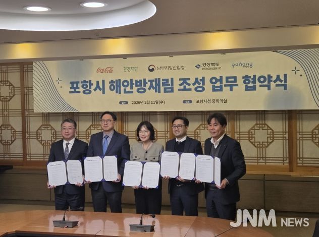 제이앤엠뉴스 | 경상북도산림환경연구원은 2월 11일, 포항시청에서 한국 코카-콜라, 환경재단, 남부지방산림청, 포항시와 포항시 흥해읍 용한리 일원 해안방재림 조성사업을 위한 업무협약을 체결했다.