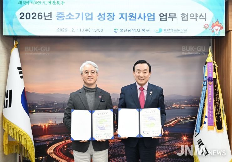 제이앤엠뉴스 | 울산 북구는 11일 구청장실에서 울산테크노파크와 2026년 중소기업 성장 지원사업 업무협약을 체결했다.