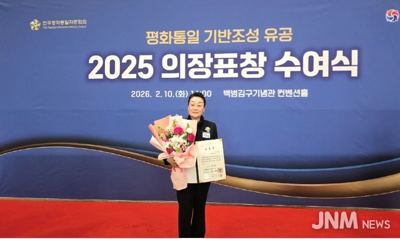 제이앤엠뉴스 | 정임행 민주평화통일자문회의 강남구협의회 차석(㈜파모소 회장)이 2026년 2월 10일 오후 2시 서울 용산구 백범김구기념관 컨벤션홀에서 개최된 민주평화통일자문회의 2025 의장표창 수여식(서울지역)에서 민주평화통일자문회의 의장 대통령 표창을 수상했다.