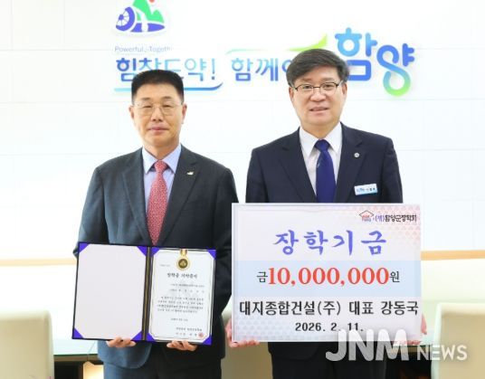 제이앤엠뉴스 | (재)함양군장학회는 2월 11일 대지종합건설(주) 강동국 대표가 함양군 지역 학생들을 위해 장학금 1,000만 원을 기탁했다고 밝혔다.