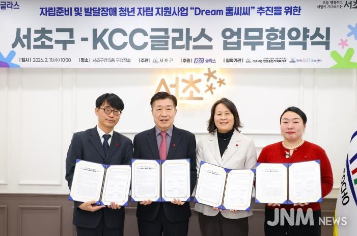 제이앤엠뉴스 | 서울 서초구가 11일 서초구청에서 ㈜케이씨씨글라스(대표 정몽익)와 자립준비 및 발달장애 청년의 자립역량 강화를 위한 ‘Dream 홈씨씨’ 업무협약을 체결했다고 밝혔다.