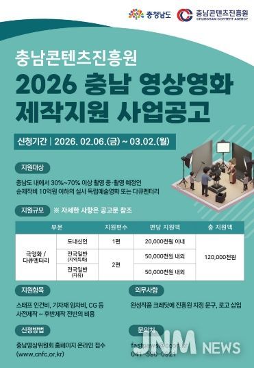 제이앤엠뉴스 | 충남콘텐츠진흥원이 충남을 배경으로 한 독립예술영화 및 다큐멘터리를 대상으로 작품당 최대 5천만 원의 제작비를 지원하는 ‘충남 영상·영화 제작지원’ 사업을 추진한다고 밝혔다.