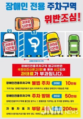 위반 유형별 과태료 기준은 ▲불법주차 10만 원(장애인주차표지 미발급 차량 주차, 전용구역 침범, 표지 미부착 등) ▲주차방해 50만 원(전용주차구역 내 또는 주변에 물건 적치, 2면 이상 이용 방해 행위) ▲장애인주차표지 부당 사용 200만 원(표지 위·변조, 대여 등)이다.
