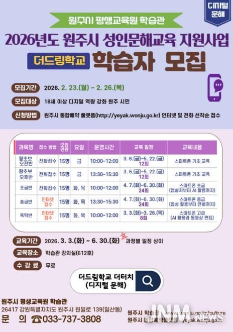 제이앤엠뉴스 | 원주시 평생교육원 학습관은 오는 23일부터 26일까지 더드림학교 더터치반(디지털 문해교육) 수강생을 모집한다.