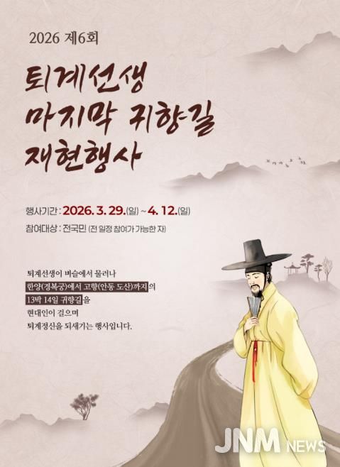제6회 퇴계귀향길 재현행사는 오는 3월 30일부터 4월 12일까지 13박 14일간 개최되며, 참가 신청은 경북문화재단 누리집을 통해 2월 22일까지 접수한다. 기타 세부 일정과 프로그램은 관계자 협의와 준비 과정을 거쳐 추후 안내될 예정이다.
