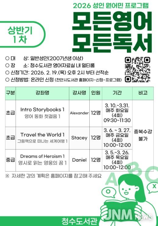 제이앤엠뉴스 | 천안시 청수도서관은 오는 3~ 6월 원어민과 함께하는 성인 영어 프로그램 ‘모든 영어 모든 독서’를 운영한다고 13일 밝혔다.