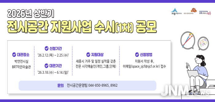 제이앤엠뉴스 | 세종시문화관광재단은 2월 12일부터 2월 25일까지 지역 시각예술인의 창작활동을 지원하고 시민들에게 다양한 전시를 선보이기 위한 ‘2026년 상반기 전시공간 지원사업 수시(1차)’ 공모를 진행한다.