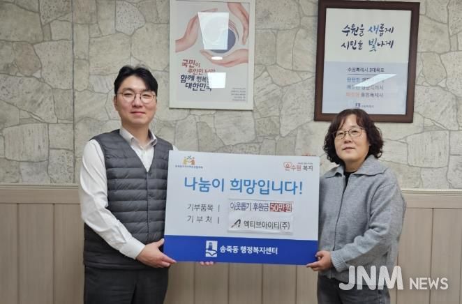 제이앤엠뉴스 | 수원시 장안구 송죽동 행정복지센터는 ㈜엑티브아이티에서 지난 12일, 설 명절을 맞아 취약계층을 위한 후원금을 기탁했다고 밝혔다.