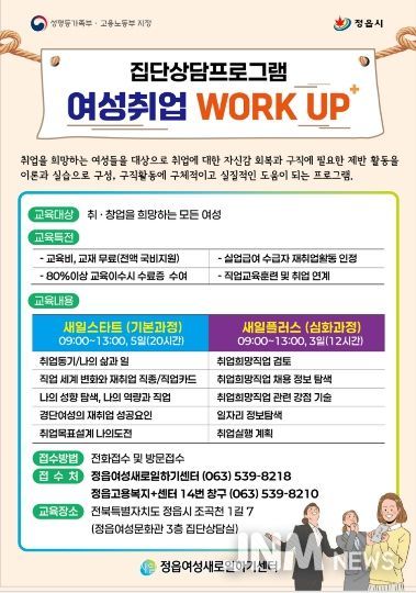 제이앤엠뉴스 | 정읍여성새로일하기센터는 취업과 창업을 희망하는 여성들의 구직 역량을 강화하기 위해 ‘찾아가는 집단상담 프로그램’을 본격 운영한다. 이번 프로그램은 가족센터와 고용복지+센터 등 지역 기관과 연계해 현장 중심으로 진행된다.