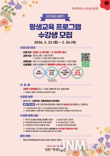 제이앤엠뉴스 | 남원시가 오는 2월 23일부터 26일까지 4일간, 2026년 평생학습관 상반기 정기교육 프로그램 수강생을 모집한다.