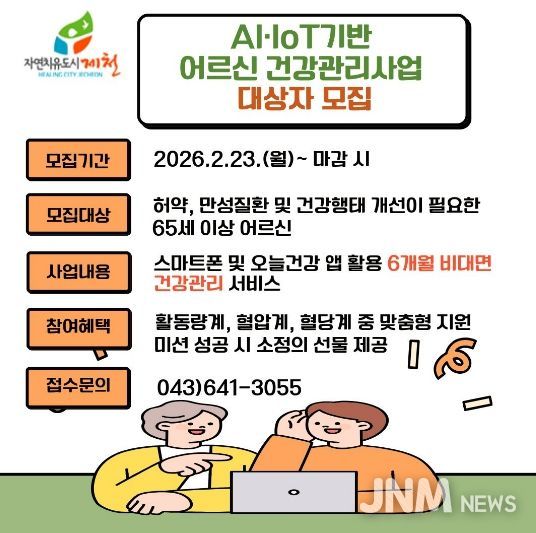 제이앤엠뉴스 | 제천시보건소(소장 안순덕)는 인공지능(AI)과 사물인터넷(IoT) 기술을 활용해 어르신들의 만성질환을 체계적으로 관리하는‘AI·IoT 기반 어르신 건강관리사업’참여자를 오는 23일부터 모집한다.