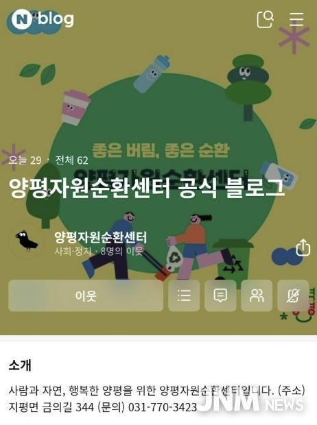 제이앤엠뉴스 | 양평군은 지난 12일 군민과의 소통을 강화하고 자원순환 정보 전달을 확대하기 위해 ‘양평자원순환센터 공식 블로그’를 개설·운영한다고 밝혔다.