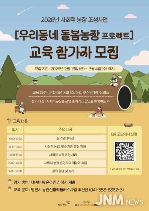 제이앤엠뉴스 | 당진시는 농촌신활력플러스사업 추진단에서 2026년 사회적 농장 조성사업의 일환으로 추진하는 ‘우리동네 돌봄농장 프로젝트’ 교육 참가자를 모집한다고 23일 밝혔다.