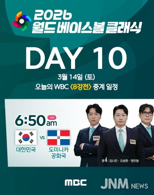 제이앤엠뉴스 | 대한민국 야구 대표팀이 2026 월드 베이스볼 클래식(WBC) 8강전에서 도미니카 공화국과 맞붙는다. 이번 경기는 미국 마이애미에서 열리며, MBC가 내일(14일) 토요일 오전 6시 50분부터 현지에서 생중계한다.