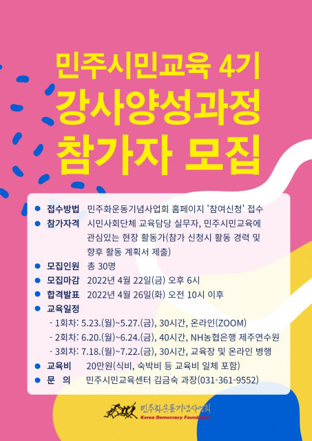 민주시민교육 분야의 활동가들을 대상으로 강의력 향상 등 역량 강화를 위해 운영하는 이 과정은 2020년 1기를 시작으로 지금까지 총 72명이 이수했다. 이번 모집은 4기 과정으로, 민주주의와 민주시민교육에 대한 지식과 이론은 물론, 교육 기획 운영 등 실무 역량까지 키울 수 있는 내용으로 구성돼 있다.