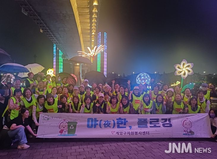 제이앤엠뉴스 | 인천 계양구자원봉사센터는 지난 24일 저녁, ‘계양아라온 아트웨이(빛의 거리 3단계)’와 ‘가을꽃 국화축제’가 열리는 현장에서 자원봉사자 74명과 함께 ‘야(夜)한 플로깅’ 봉사활동을 진행했다.