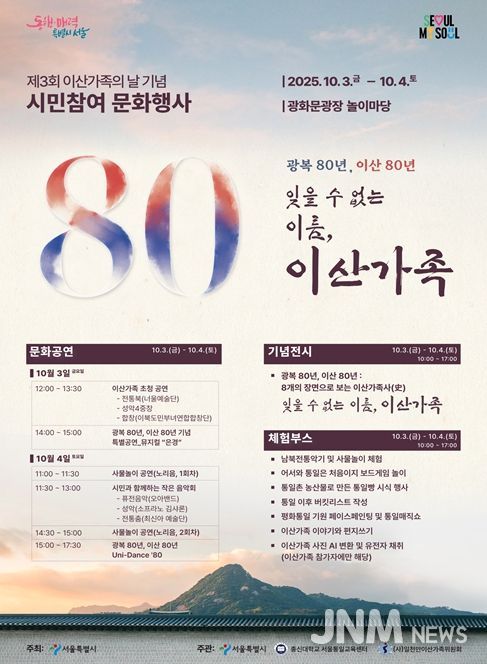 제이앤엠뉴스 | 서울시는 오는 10월 3일부터 10월 4일까지 광화문광장 놀이마당에서 제3회 이산가족의 날을 맞아 시민참여 문화행사를 개최한다.