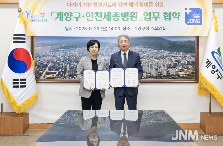 제이앤엠뉴스 | 인천광역시 계양구는 9월 29일 인천세종병원(병원장 오병희)과 ‘다자녀 가정 병원진료비 감면 확대’를 위한 업무협약을 체결했다.