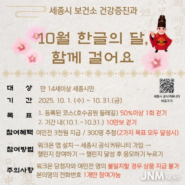 제이앤엠뉴스 | 세종특별자치시 보건소가 1일부터 31일까지 한글날을 맞아 ‘10월 한글의 달 함께 걸어요’ 걷기 도전 행사를 운영한다.
