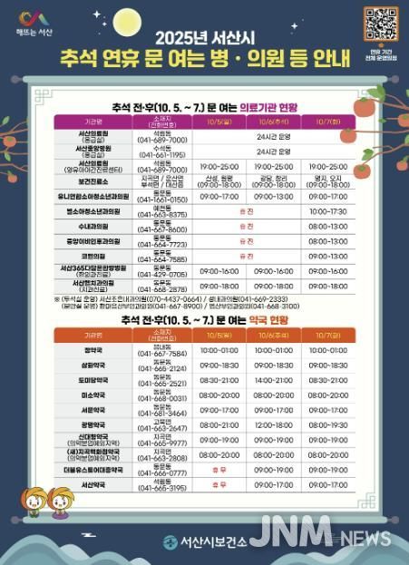 김용란 서산시보건소장은 “연휴 기간 진료 이용에 불편이 없도록 세심히 살펴 시민과 귀성객 모두가 건강하고 안전한 추석을 보내실 수 있게 최선을 다하겠다”라고 말했다.