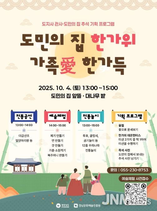 조여문 경남도 문화예술과장은 “경남 도민의 집에서 온 가족이 함께 웃고 즐길 수 있는 다채로운 문화행사를 준비했다”라며, “전통공연과 예술체험을 즐기며 행복한 추석 연휴를 보내시길 바란다”라고 전했다.